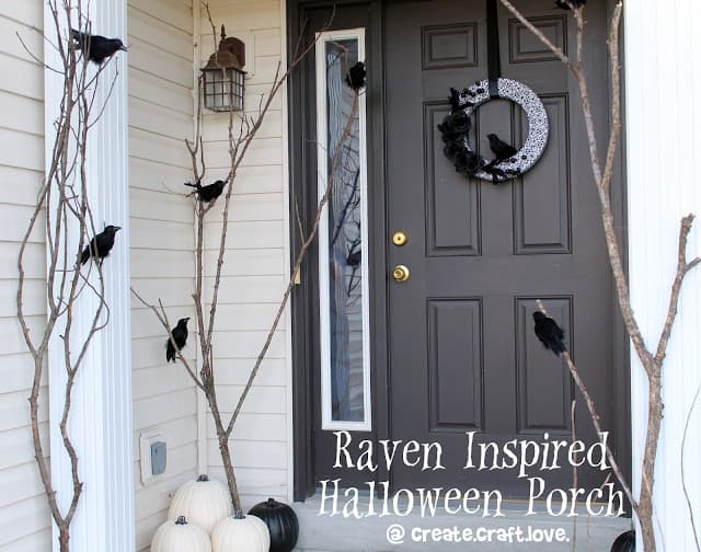 Raven Porch Branchees is super simple and can be done as the Last Minute, Inexpensive DIY Halloween Decorations on a Budget. Take the kids out to collect sticks and branches and add them to the porch for Halloween fun.